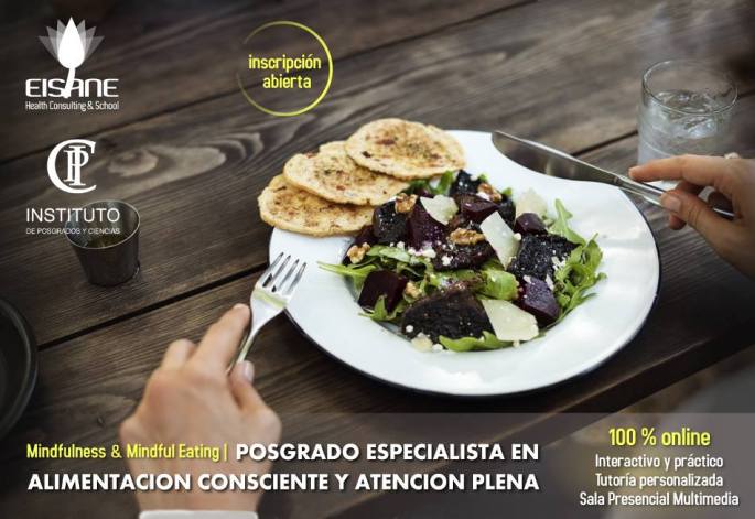 El próximo 24 de febrero de 2019 iniciamos la 3ª edición del POSTGRADO ESPECIALISTA EN ALIMENTACIÓN CONSCIENTE Y ATENCIÓN PLENA (100% online e interactivo) en el que participo como docente junto con mi compañera Maria José Gutiérrez Rico, (Licenciada en Nutrición y Ciencias de los alimentos y especialista en Alimentación Consciente), organizado por EISANE Health Consulting & School –escuela internacional para el desarrollo, liderazgo y excelencia del sector Salud y Empresa.